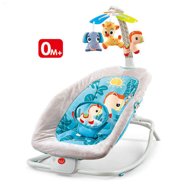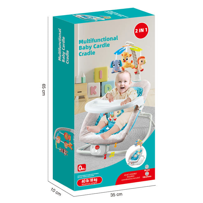 Bring comfort, entertainment, and practicality together with this 2-in-1 Baby Rocker and Feeding Chair. Designed to grow with your baby, it functions as both a relaxing rocker for play and nap time, and a convenient feeding chair with a removable tray. The overhead colorful toy bar with soft hanging animal toys keeps your little one engaged and stimulated, while the vibration/music feature helps soothe your baby into a calm and happy state.
