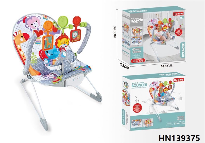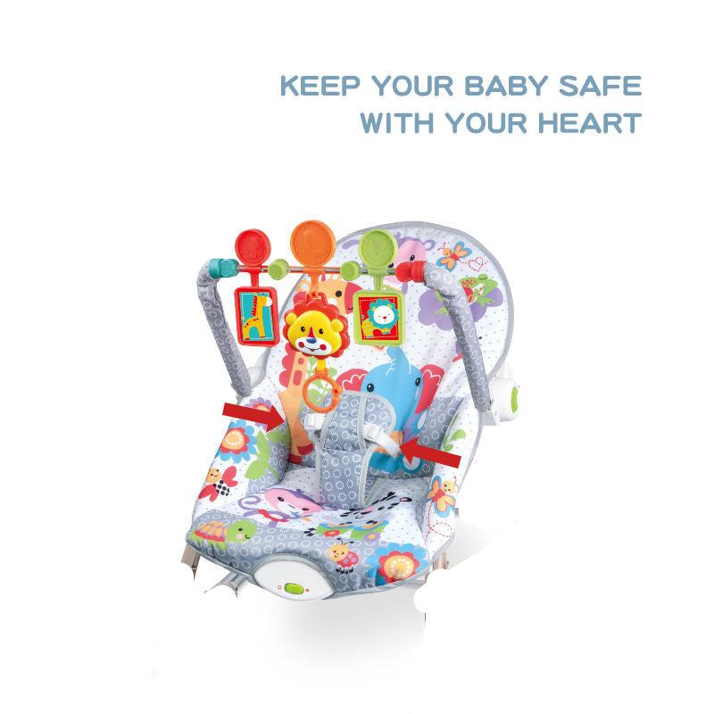 Give your baby the perfect combination of fun and relaxation with this colorful jungle-themed baby bouncer chair. Designed with a soft, padded seat and calming vibration settings, it keeps your baby comfortable and content. The interactive toy bar features adorable animal toys like a lion, bear, and spinning elements to promote sensory development and hand-eye coordination. Equipped with a secure harness and non-slip base, this lightweight bouncer is ideal for both playtime and nap time.