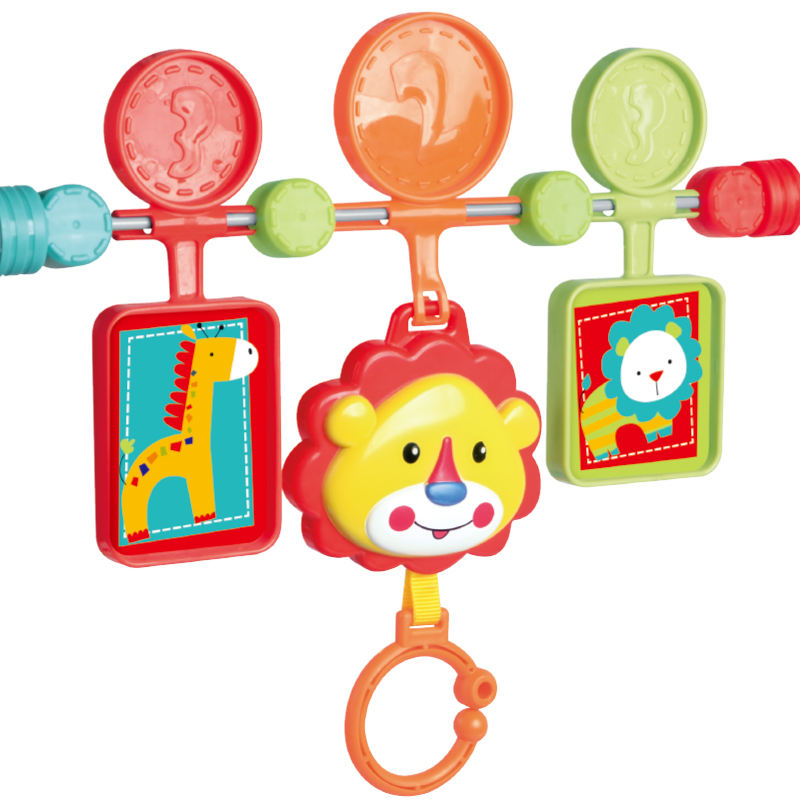 Removable toy bar with 3 hanging toys (lion, bear, and spinner)