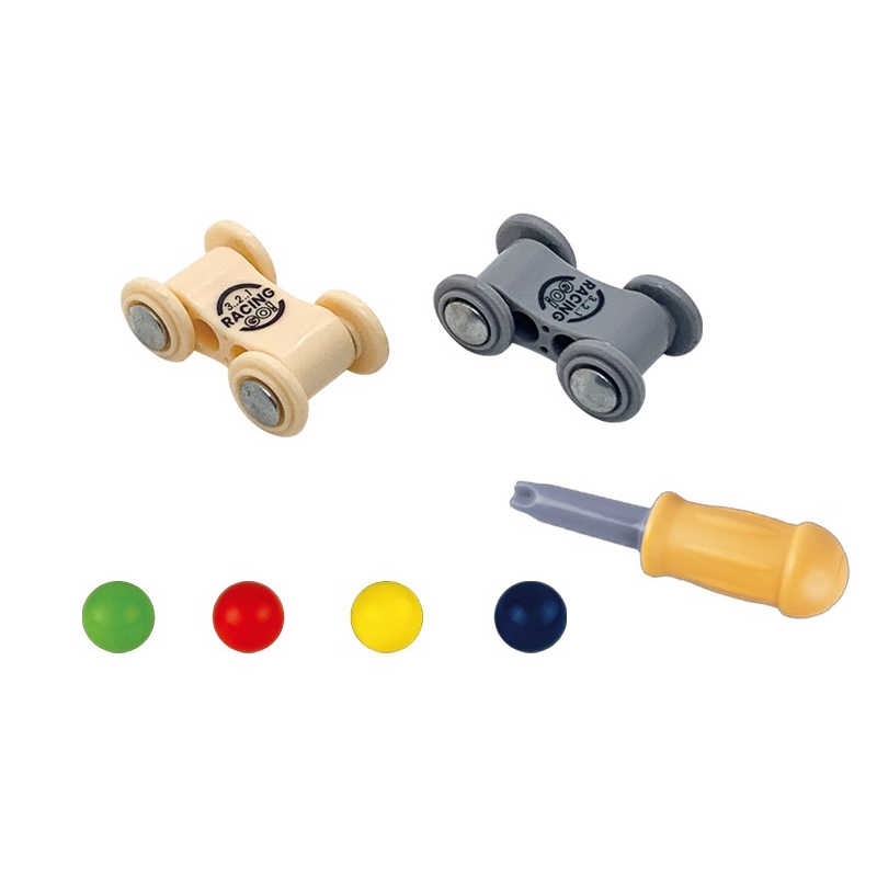 56 pieces including colorful ramps, screws, wheels, and screwdriver