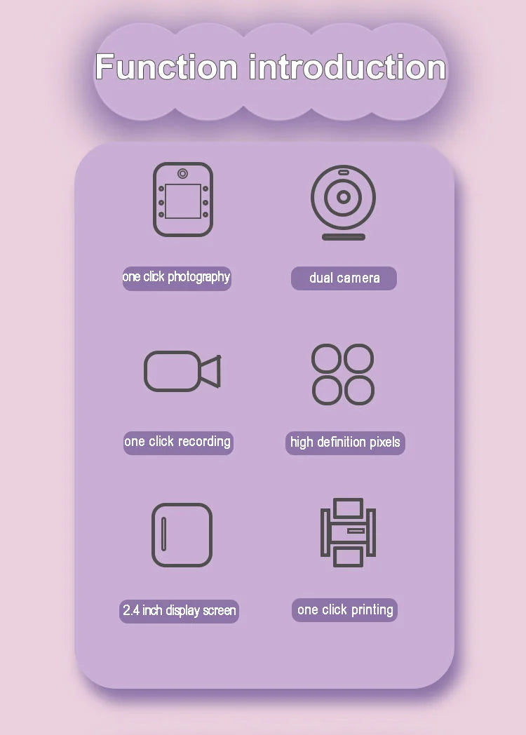 Capture magical moments and print them instantly with this adorable Kids Instant Print Camera! Designed with a cute animal-inspired design and RGB glowing silicone ears, this camera turns photography into a fun and interactive activity for children.